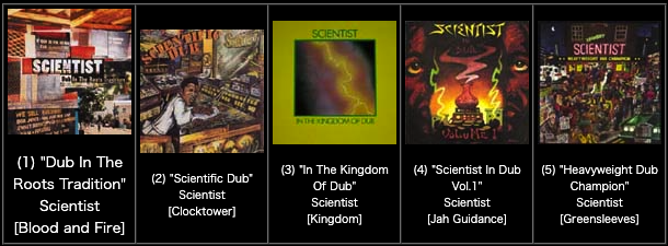 まずリンヴァル・トンプソン音源のダブなら、本人の『Look How Me Sexy』、フレディ・マクレガー『Big Ship』、バーリントン・リーヴィ『Poorman Style』などが元ネタの『Scientist and Jammy Strike Back!』なんていうトロージャン盤が定盤だが、タビー塾の兄弟子ジャミーに7曲譲り、サイエンティストの仕事は3曲のみ。そこで(4)の『Scientist In Dub Vol.1』、ミックス於タビーズ。このジャケットの絵には「 81」と記載されているが、これを描いたスミス画伯が同じくジャケを手がけたジャー・ガイダンス盤で、他のc81作品といえば名作ジョニー・オズボーンの『Night Fall』。ズバリこの4.はその『Night Fall』の「Kiss Somebody」で幕が開く。同じくゥ81盤のウェリング・ソウルズ『Wailing』から「Who No Waan Come」もネタとして確認できたが、この2曲は同じ81年にグリーンスリーヴスから出た『Scientist Meets The Space Invaders』で別ミックスが聴ける。他にホレス・アンディも最低2曲使われていることが声で分かるこの(4)に、過激なのにステディなサイエンティストの真価を見る。Vol.1というが、Vol.2は見た憶えがない。