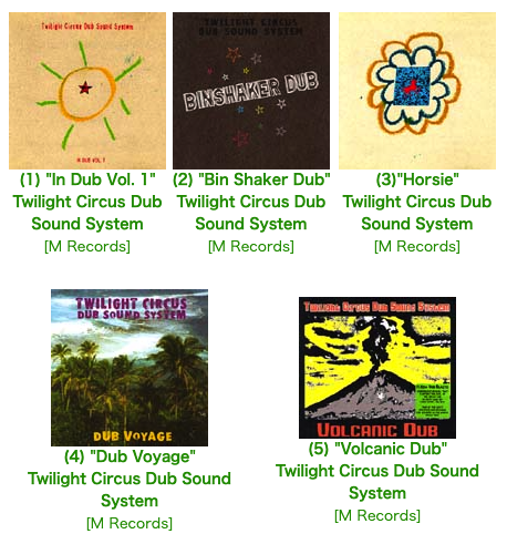 予備知識無しに手にしたCDは、ラメの色紙やクレヨンを使って手作業で作られたジャケットの『Horsie』(3)。裏ジャケに写る6畳位の自宅スタジオにはアナログシンセやら何やらジャンクな器材がごちゃごちゃ並んでいる。しかも連絡先はテクノが盛んだが、デタミネーションズにライヴをやってくれないかとオファーが来た事もあるオランダ。さて、どんな音?…と、Twilight Circus Dub Sound System=Ryan Mooreとの出会いはそんな風である。年齢は不祥だが、たぶん現在30代半ば。小さい頃からインドや西インド諸島からの移民が多いカナダのバンクーバーに住んでいたRyanにとって、隣近所でいつも流れていたロック・ステディは幼い頃から非常に身近な音楽だった。81年にレゲエ・バンドを結成し、85年頃にはダブもやっていたそうだが、87年に実験的なロック・バンド、レジェンダリー・ピンク・ドットにドラマー兼ベーシストとして加入。スタジオ・ミュージシャンとして様々なオルタナティヴ系バンドの録音にも参加しつつも、やっぱりそれと平行して一人でレゲエのプロジェクトもやっていたそうだ。