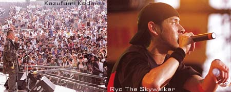 次に登場したのがケツメイシというところが、このイヴェントの凄いところ。ヒット曲を多くもつ彼らだけに、会場は一気にヒートアップ。そして、日が暮れ始める6時過ぎあたりになると、ホーム・グロウンのセカンド・セット。昨年も出演のキーコ、リョー・ザ・スカイ・ウォーカー、プシン、ムーミンらが登場。キーコは懐妊の発表をするなどアット・ホームな雰囲気。リョーはバスケットボールをドリブルしながら全身ジョーダンで登場。今年最初のステージとのことだったが、コーンヘッドと「ゲリラ・モンスター」を披露したり、流行の "Diwali" リズムを使用したりと流石のステージ。「ふたりワンマン」で会場も大盛り上がり。ムーミンとプシンは貫禄。ホーム・グロウンにキーボードの渡辺貴浩を加えたバックとの息もバッチリ。プシンは去年の声の不調を吹き飛ばすステージだったし、コーンヘッドとの新曲「禁断の森」も披露したムーミンはラストの「ムーンライト・ダンスホール」でライターの花を咲かすまで30分余の熱唱だった。