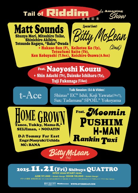 石井志津男の本『テイル・オブ・リディム』が11月に出版されるが、その記念としてイベントが企画されている。石井は1980年に映画ロッカーズの日本配給をして以来レゲエなどの音楽と関わりレーベル”オーバーヒート”を立ち上げ、フリー・ペーパーRiddim(リディム)を38年間349号のコロナ禍まで発行した。その間、多くのレゲエ・コンサートを開催し、ジャマイカ人アーティストのプロデュースからムーミンやプシンといった日本人アーティストの育成にも携わったが、ストリート・カルチャーやアートにも強い関心を持っていた彼の広範な親交をおもわせるイベントが開催される。当日はUKからビティ・マクリーンも来日し、マット・サウンズとホーム・グロウンという2バンドに数々のゲストが参加するスペシャルなライブが行われる。また石井と友人たちのトーク・セッション、ビデオ、DJなども企画されている。